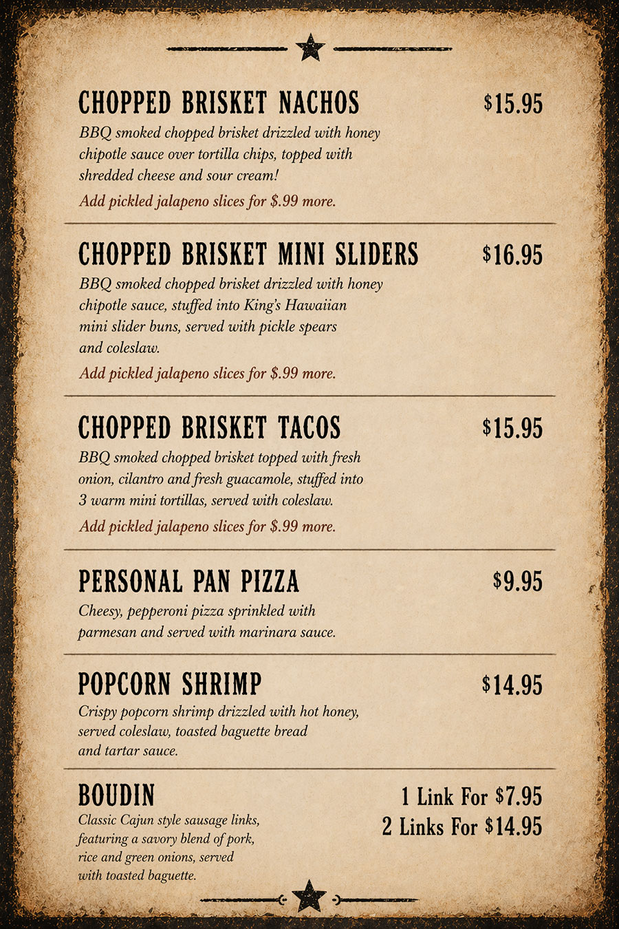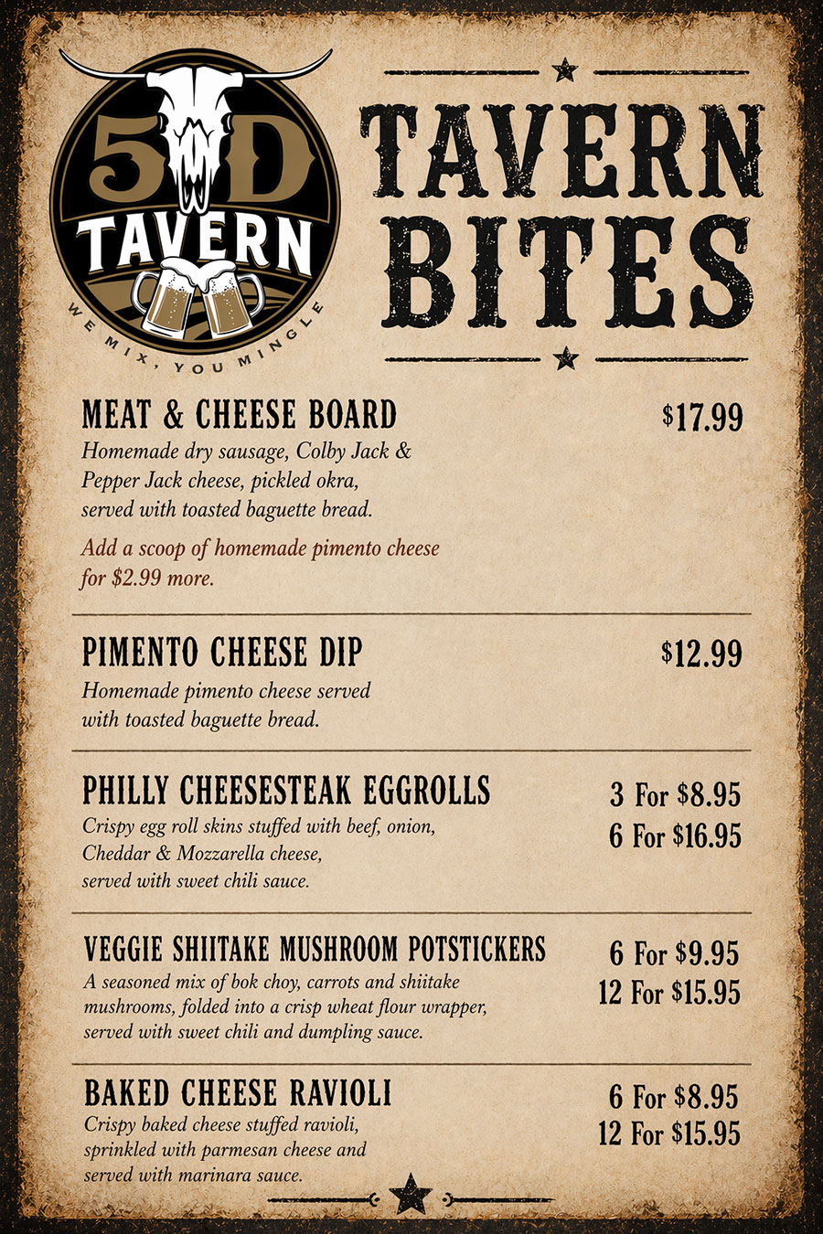 Drink Menu Take a look through our Cocktail Menu! Click here to view the mobile friendly PDF menu.Shareables Menu Featured Items Meat & Cheese Board Pulled Pork Sliders MenuHomeMenuGalleryMeet The TeamContact Usemail us info@5dtavern.com Follow Uscorporate 5D Tavern 318 FM 237 Yorktown, TX 78164 Phone Corporate Office: 361-564-7850Website Design By Ranch House Designs, Inc.
